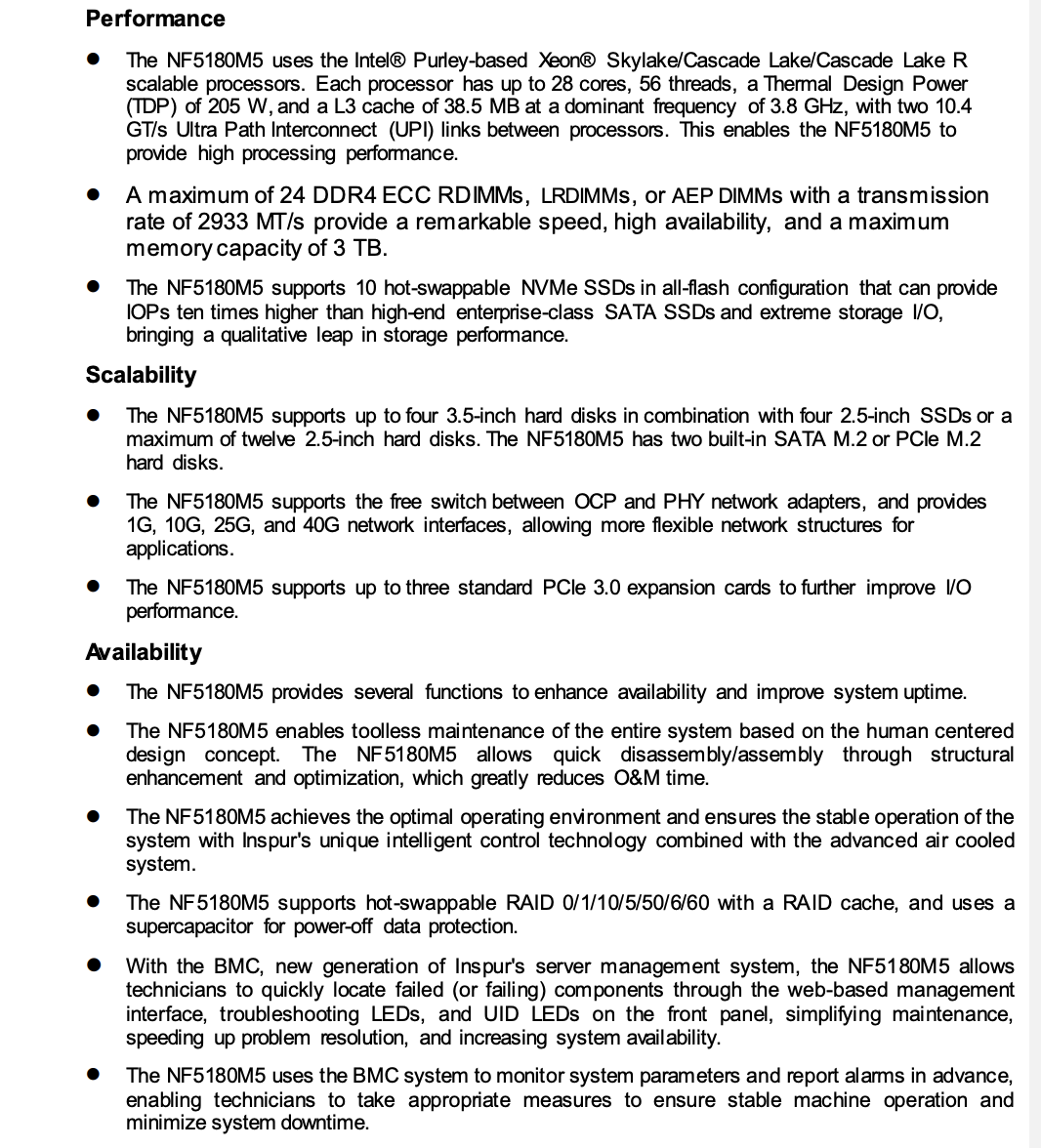 The Inspur NF5180M5 server is a 1U 2-socket rack server designed for Internet, Internet Data Center(IDC), cloud computing, enterprise market and telecom applications based on Intel® Purley-basedXeon® scalable processors. This product supports services requiring a high network bandwidth, highcomputing performance and large memory capacity, and provides an excellent solution for customersrequiring density and storage. It is especially suitable for business intelligence, financial services, publiccloud and private cloud applications with demanding requirements on servers.