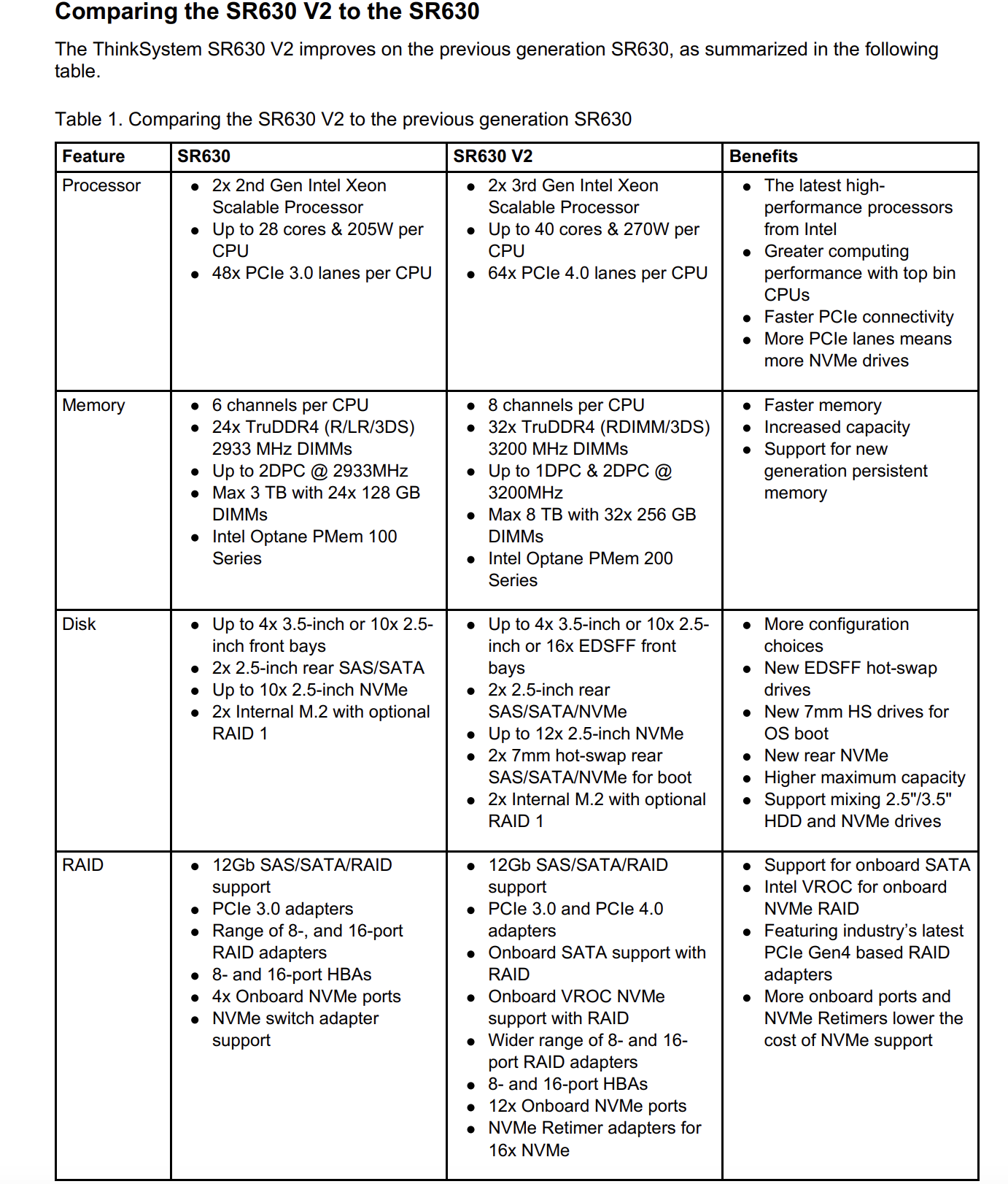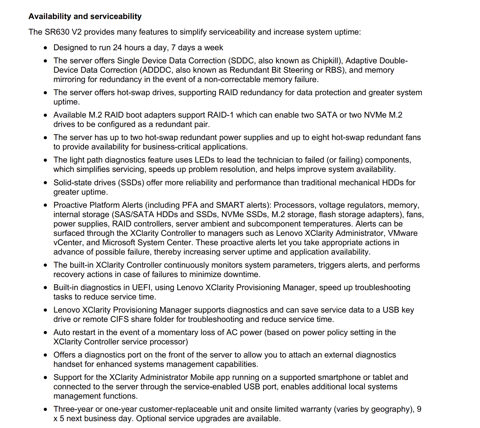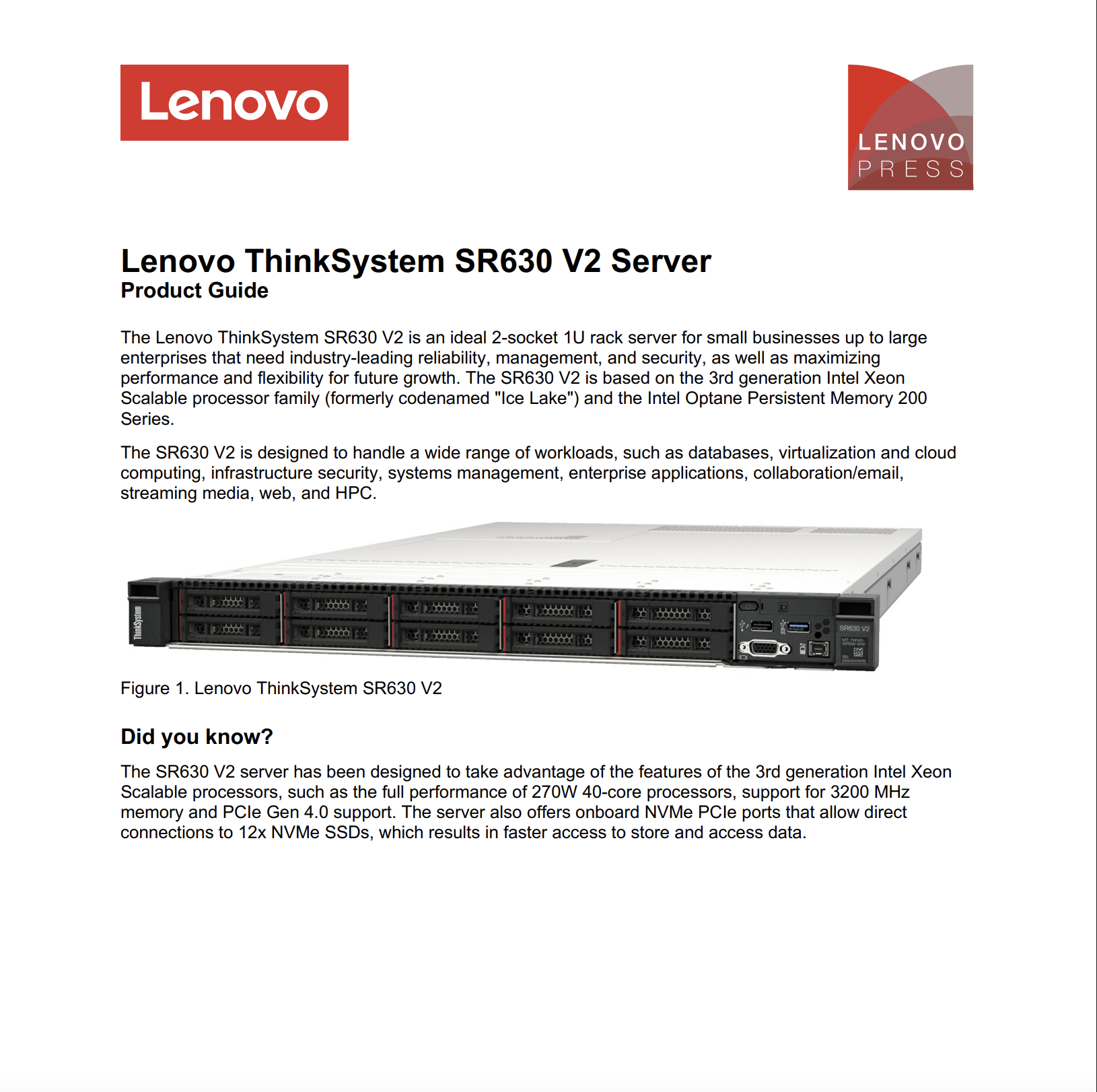 Combining performance and flexibility, the SR630 V2 server is a great choice for enterprises of all sizes. Theserver offers a broad selection of drive and slot configurations and offers numerous high performancefeatures. Outstanding reliability, availability, and serviceability (RAS)